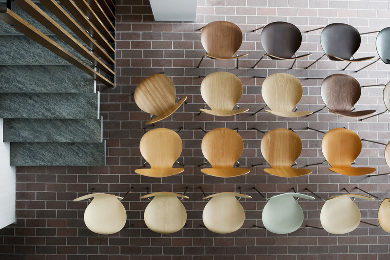 El Royal Hotel 1956-1961, situado en Copenhague, es una de las obras maestras de Arne Jacobsen. Para la decoración del hotel se diseñaron varias piezas de muebles, lámparas y tejidos, así como de cubiertos, vasos y tiradores de las puertas. Como contrapuntos significativos a la rigidez vertical del monumental edificio, su sillón, la silla de cisne y la silla del huevo, se destacan como esculturas orgánicas.